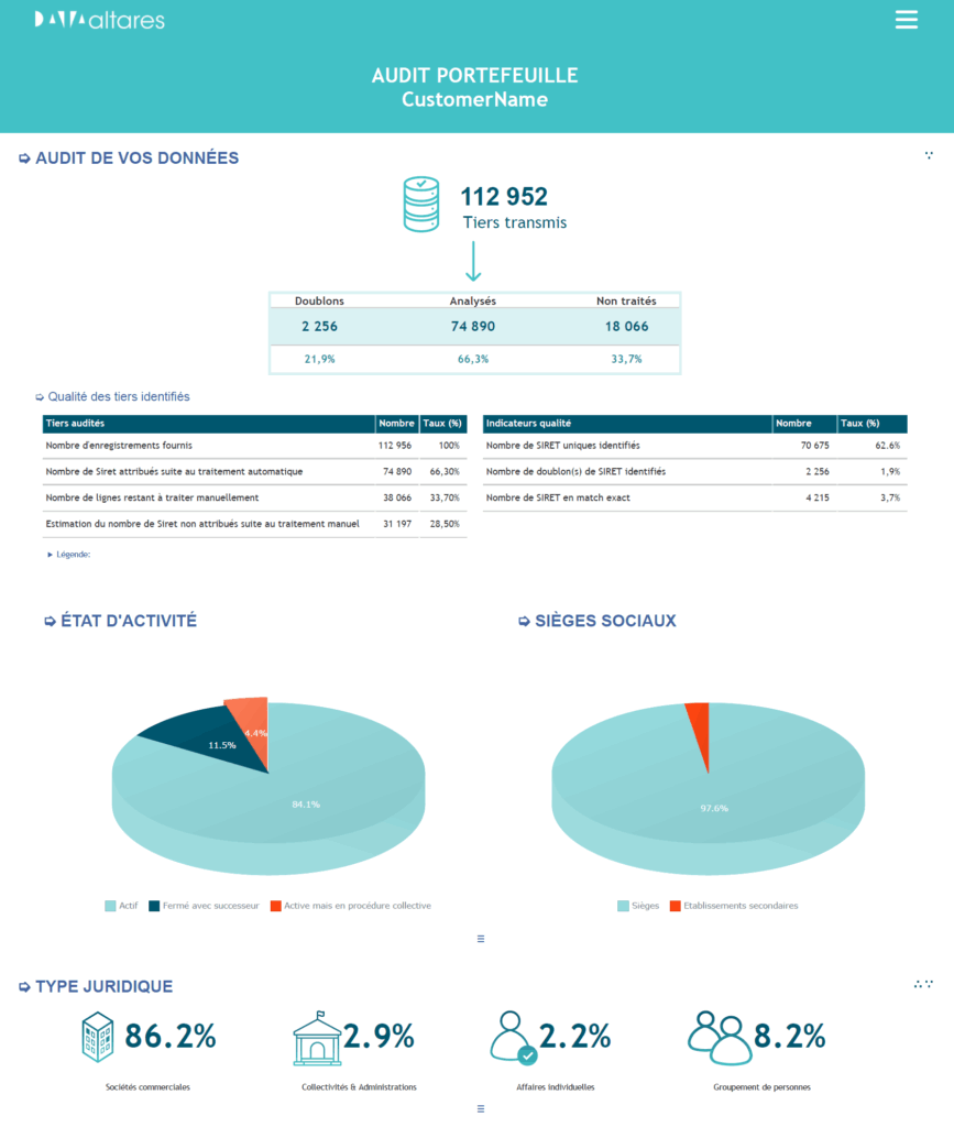 Ce service gratuit permet d’identifier les problèmes de Data Quality sur les portefeuilles clients ou fournisseurs (doublons, sociétés fermées, remontées d’incohérences…).